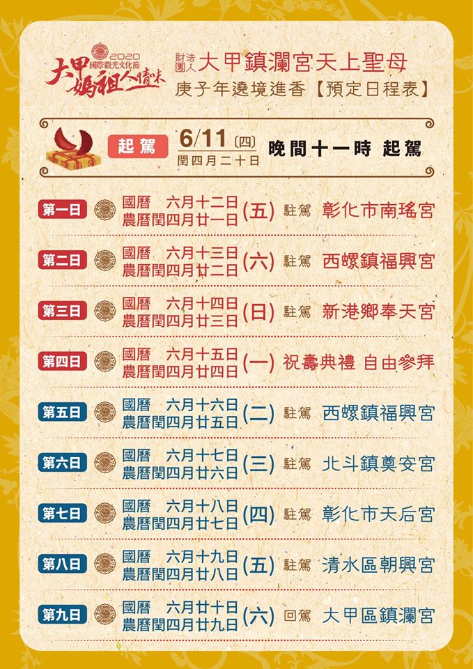 因新冠肺炎,媽祖進香日期決定日期臨時,所以廟方資料目前發布的較少,應該是會陸續發布,我們將先以2019年的路徑、時間給各位香友做參考。
